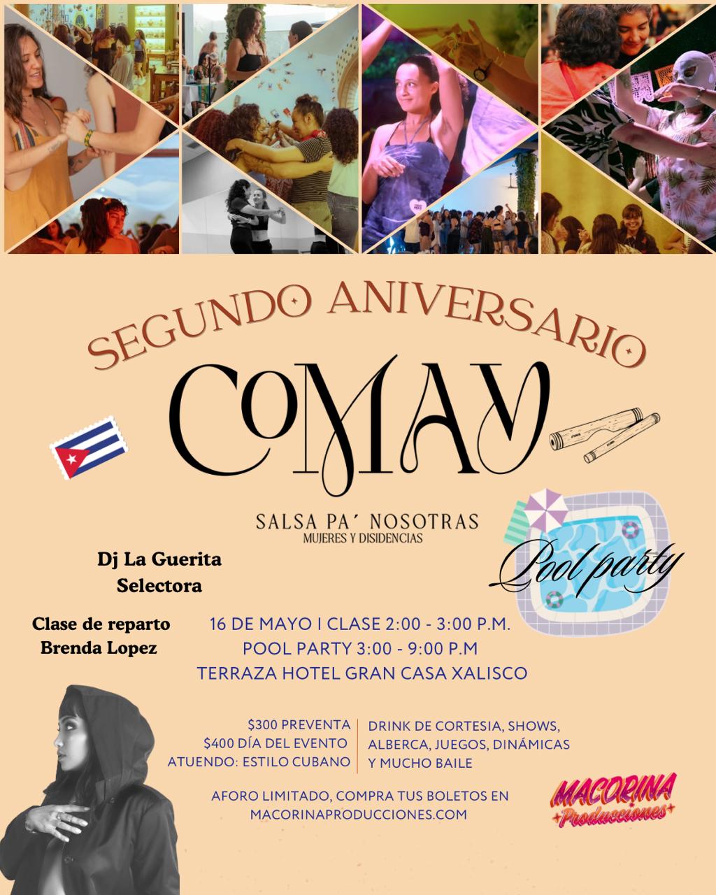 Celebra el 2º aniversario de COMAY con una experiencia única de salsa pa’ nosotras: clase, pool party, shows, DJ en vivo y mucho baile en la terraza del Hotel Gran Casa Xalisco. Cupo limitado — asegura tu lugar y vive una tarde llena de ritmo, comunidad y diversión.
